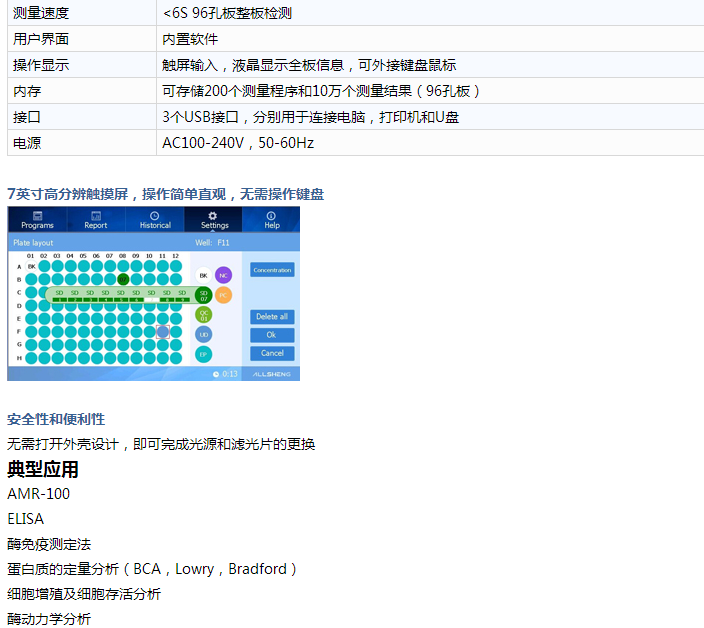 AMR-100酶標(biāo)儀是一款基于濾光片的高品質(zhì)光吸收酶標(biāo)儀,波長(zhǎng)范圍340nm~750nm,適合科研和臨床的應(yīng)用。適用96孔板,可滿足不同通量的要求。7英寸觸屏液晶顯示,易于使用,不需操作鍵盤(pán),數(shù)據(jù)和程序可保存在儀器內(nèi),或者通過(guò)U盤(pán)導(dǎo)出。讀板速度快,能實(shí)現(xiàn)快速測(cè)量,提供準(zhǔn)確性高,重現(xiàn)性好的測(cè)量結(jié)果。是實(shí)驗(yàn)室酶標(biāo)儀的理想選擇。