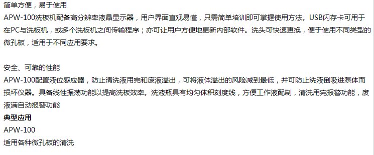 產(chǎn)品分類: APW-100全自動(dòng)洗板機(jī)用于96孔微孔板清洗的全自動(dòng)洗板機(jī)。結(jié)構(gòu)緊湊,清洗高效并且堅(jiān)固耐用。適用多種規(guī)格微孔板:平底、U型底、V型底和C型底的清洗,它具備了其他洗板機(jī)選配的各種特殊功能,程序化的設(shè)計(jì)特別適用于那些微孔板多種應(yīng)用的工作量大的實(shí)驗(yàn)室。儀器還可進(jìn)行微孔板浸泡和振蕩。低殘液量,平均每孔≤0.5μl,消除高背景信號(hào),確保結(jié)果可靠