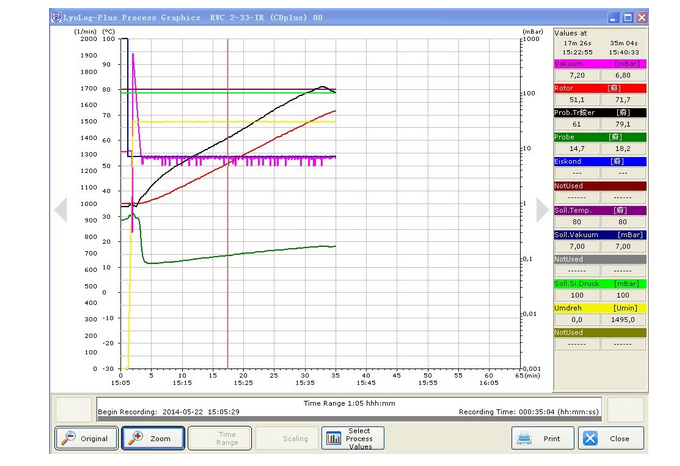德國Christ公司是專業(yè)生產(chǎn)真空離心濃縮儀的廠家,有著60多年的歷史。就其濃縮儀中樣品溫度的變化,我們進(jìn)行了詳細(xì)的數(shù)據(jù)記錄(圖1、圖2所示),從圖1我們發(fā)現(xiàn),當(dāng)真空值設(shè)為7mbar,腔體加熱溫度設(shè)為79℃時(shí),離心腔在61~79℃逐漸升溫,對(duì)應(yīng)的轉(zhuǎn)子溫度是51.1~71.7℃逐漸升溫,而樣品溫度在14.7~18.2度之間。