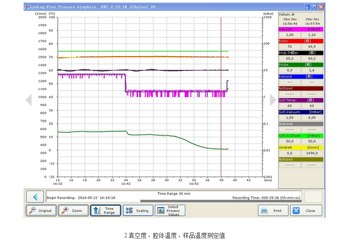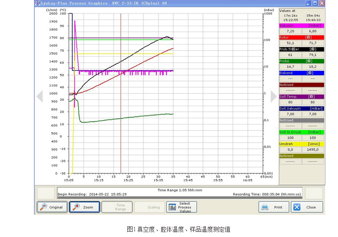 德國Christ公司是專業(yè)生產(chǎn)真空離心濃縮儀的廠家,有著60多年的歷史。就其濃縮儀中樣品溫度的變化,我們進行了詳細(xì)的數(shù)據(jù)記錄(圖1、圖2所示),從圖1我們發(fā)現(xiàn),當(dāng)真空值設(shè)為7mbar,腔體加熱溫度設(shè)為79℃時,離心腔在61~79℃逐漸升溫,對應(yīng)的轉(zhuǎn)子溫度是51.1~71.7℃逐漸升溫,而樣品溫度在14.7~18.2度之間。